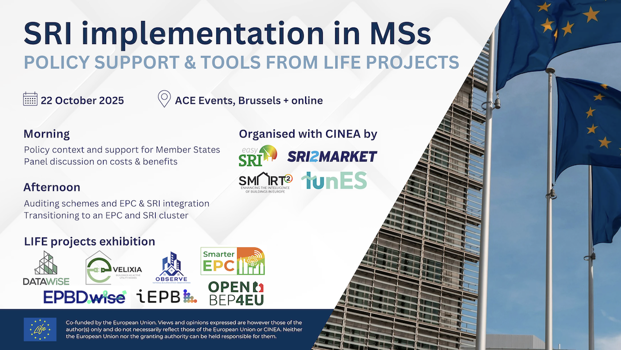 This joint event is organised by CINEA together with the LIFE projects easySRI, SmartSquare, SRI2MARKET, and tunES, and includes contributions from DATAWiSE, EPBD.wise, EVELIXIA, iEPB, SmarterEPC, openBEP4EU, and OBSERVE.
